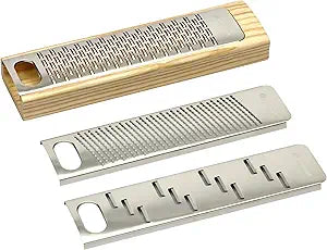 Multi-function grater, stainless steel blades including Fine Zester blade, Ribbon blade and shaver blade.