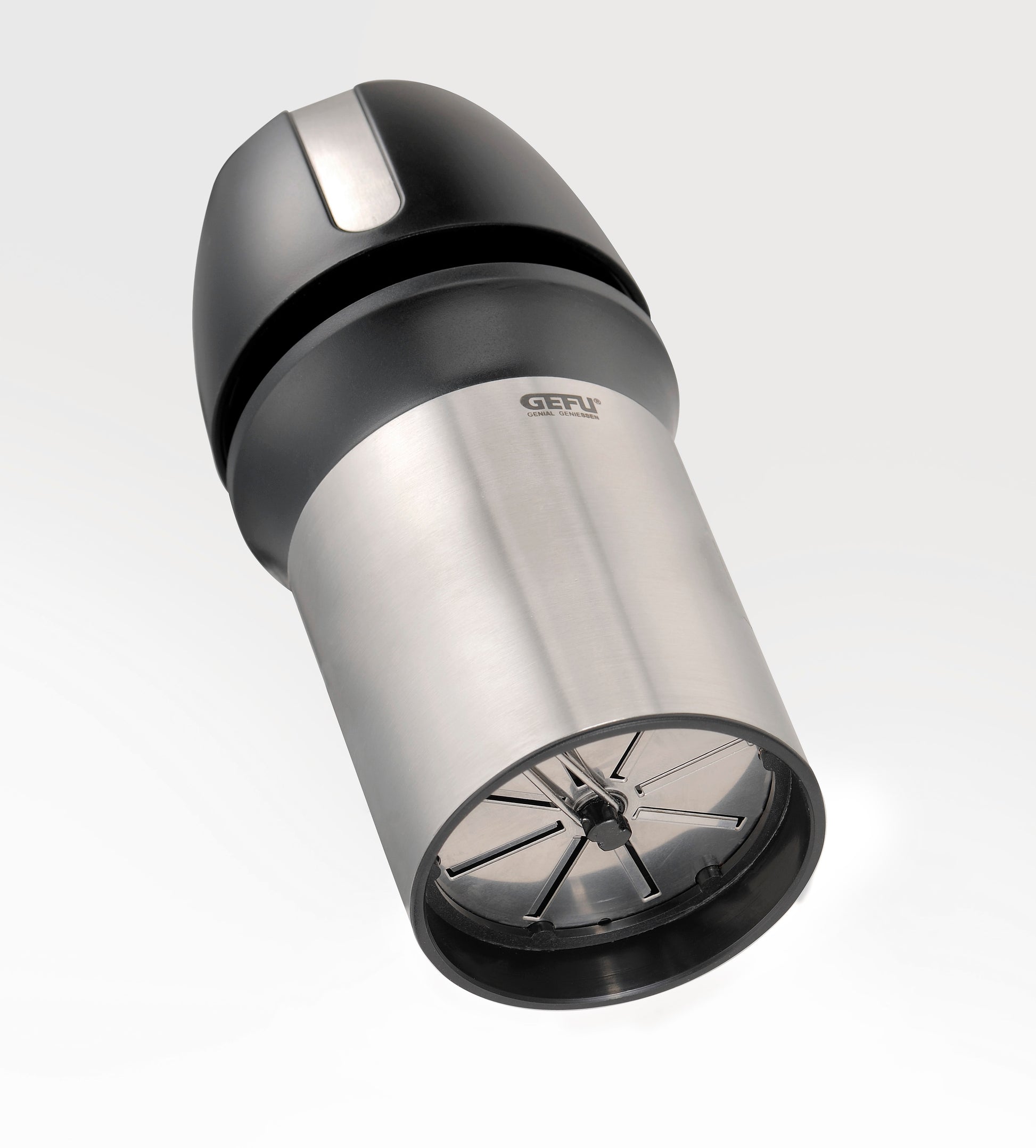 Multifunctional cheese grater with two interchangeable discs, makes shavings or fine crumbs from hard cheese, chocolate or nuts in no time at all. Simply insert the required grater disc, fill the food you wish to cut, grate – and done! The material can be grated without waste. Remainders can be stored airtight in the lid. A wiper and the flavor-lock lid help you keep the workplace or table clean after grating. While not in use, the second grater disc may be stored in the lid. The Laser Cut Technique guarantees sharp grater discs. 20 year guarantee